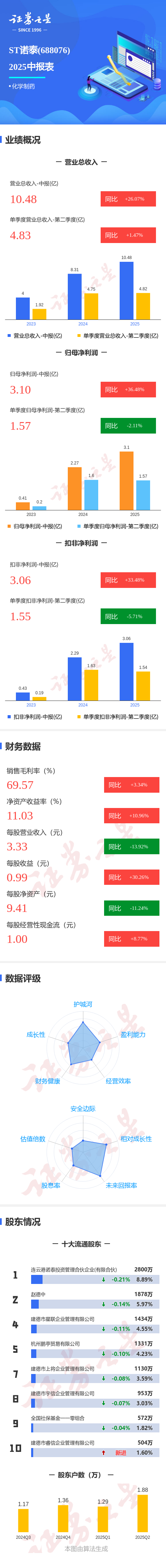 证券之星音书,ST诺泰(维权)2025年中报透露,公司主营收入10.48亿元,同比飞腾26.07%;归母净利润3.1亿元,同比飞腾36.49%;扣非净利润3.06亿元,同比飞腾33.49%;其中2025年第二季度,公司单季度主营收入4.83亿元,同比飞腾1.47%;单季度归母净利润1.57亿元,同比下落2.12%;单季度扣非净利润1.55亿元,同比下落5.72%;欠债率49.53%,投资收益111.66万元,财务用度1903.63万元,毛利率69.57%。